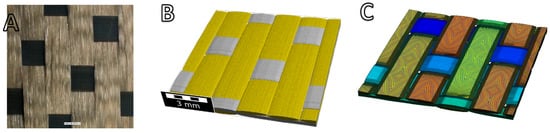 The sample used in the split resonator measurements corresponds to a nearly pure alumina (Al2O3) known as Nextel™ 610 fiber fabric (a product of 3M Company). The fabric is identified by 3M as DF-13-4500 and is crafted in a 5-Harness-Satin weave pattern. Figure 12A depicts the fabric at a magnification of 20× with appropriate right illumination, captured using a digital microscope (model VHX-7000, Keyence GmbH, Neu-Isenburg, Germany). In Figure 12A, the machine and cross-direction yarns are clearly distinguishable, appearing in dark and light contrast, respectively. Table 3 presents a summary of the DF-13-4500 fabric properties.