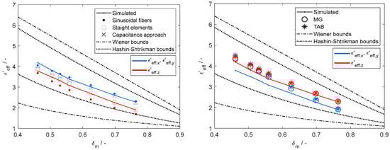 Comparison of the effective permittivity with porosity of the woven fabric models from numerical calculations estimated using interconnected straight elements, sinusoidal fibers, and the capacitance approach (left) and with ellipsoids (right) from the Maxwell–Garnett and Traditional Anisotropic Bruggeman mixing relations.