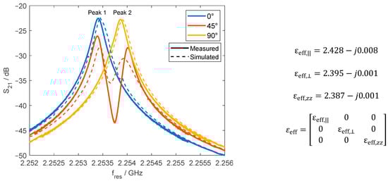 Numerical calculations were used to identify the effective permittivity that reproduces results at 0°. Then, the orientation tensor that produced that effective permittivity was determined by using the interconnected straight filament approach, with permittivities set to for alumina and for air. The resulting orientation tensor at 0° is T = . Further, simulations of the resonator were then performed by performing in-plane rotations of tensor at the angles of 0°, 45°, and 90°, with the resulting simulated shown in Figure 15. While minor differences are observed between the experimental and simulated —likely attributable to variations in fiber orientation introduced during the imperfect manual rotation of the fabric—another contributing factor is the use of averaged sample characteristics like thickness and porosity (Table 7). Nevertheless, there is a good agreement between these simulated and actual measured plots that confirm the applicability of this approach.