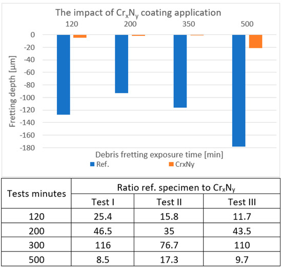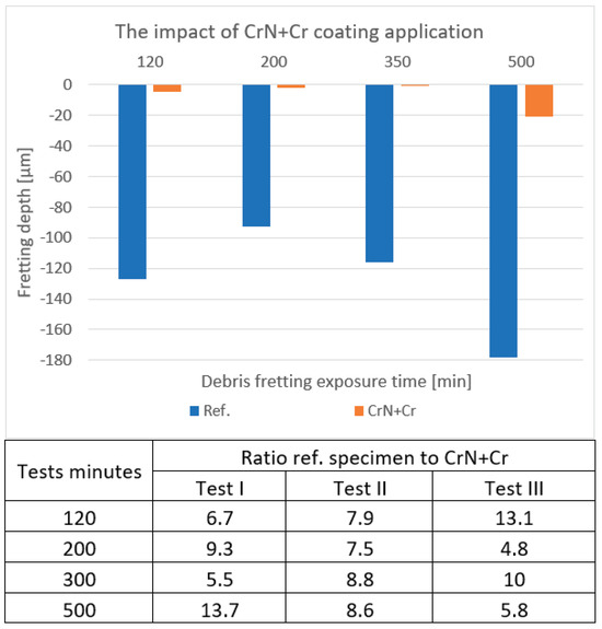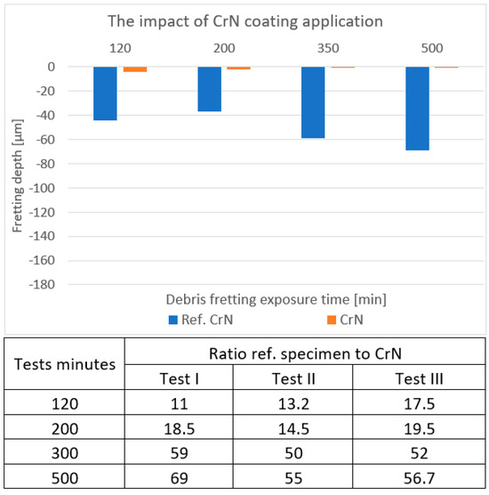 It is worth noting that the fretting depth trend exhibited a similar slope coefficient for all the uncoated specimens. This finding indicates the validity of the tests conducted, as the degree of material loss was proportional and comparable across all cases, despite the low wear buoyancy. The highest discrepancy was observed in the case of the CrN specimen. For the multi-layer coating, the trend line showed a smaller discrepancy compared to that for the other specimens. These discrepancies (CrN and multi-layer) were relatively small, and there was no change in the overall trend. The discrepancies arose from the slightly different test arrangements, meaning each test should be compared to the reference specimen.