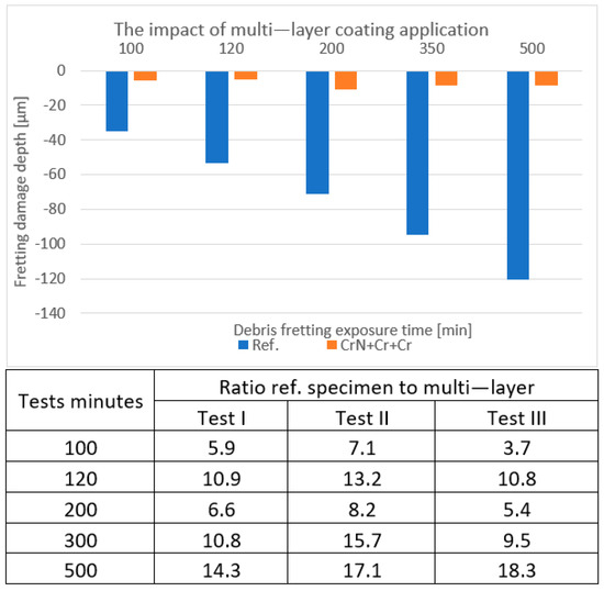 In the case of the multi-layer coating, the outermost layer was one of the thickest, exceeding 10 µm. The marks obtained on this specimen (the orange bars in Figure 8) reached just about 10 µm. In the case of the uncoated specimen, the minimal depth of the fretting marks exceeded 40 µm.