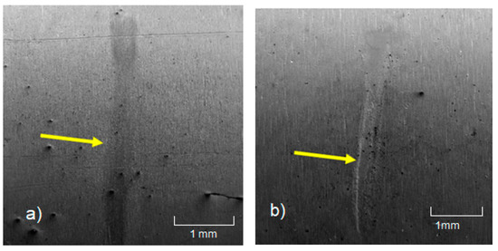 The SEM+FIB (Focused Ion Beam) analysis visually confirmed the measured maximum depth of the fretting marks. In the latter case, the fretting extended through the Cr layer. An overall image from the SEM analysis is shown in Figure 10. The analysis was conducted at an accelerating voltage of 10 kV in secondary electron (SE) mode.