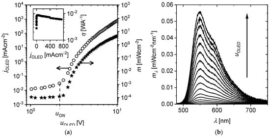 (a) Current–voltage characteristics (circles) and the dependence of the total radiant emittance on the voltage (stars) for OLED based on SY; the symbol denotes the threshold voltage; the inset shows the dependence of the current efficiency on the current density ; (b) spectral emittance for different voltage values .