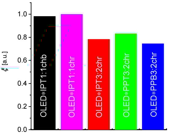 Five different OLSD photodetectors were tested as a receiver in optocouplers with the OLED transmitter based on SY. It was assumed that the optocouplers should fulfill three basic conditions: (a) they should transmit signals from the transmitter to the photodetector with high efficiency, (b) they should be characterized by a high signal transmission rate while maintaining good DC parameters, and (c) they should not lose their electro-optical properties after encapsulation and operate stably under normal atmospheric conditions for at least several weeks. The characteristics of the tested OLSD devices with active layers made of mixtures of different semiconductors are given in the Supplementary Information (Figure S4 and Table S1). Based on the measured spectra of emittance spectral density m_λ for the OLED emitter (measured for = 0.11 mAcm−2) and the OLSD response , the overlap integrals were calculated. These were used to determine the ability of each transmitter/receiver pair to effectively convert light energy into photocurrent. The highest values of the relative overlap integral ξ (see Figure 4) were found for the OLED/IPT1:1chb and OLED/IPT1:1chf systems.