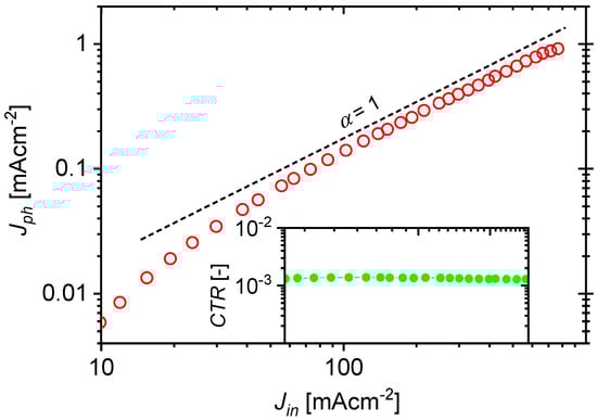 The discrepancy between the estimated and experimentally determined CTRdc and CTR0 coefficients could be due to the phenomenon of electron trapping in the acceptor phase or/and holes in the donor phase in the bulk heterojunction in OLSD. Trapping reduces the population of mobile charge carriers and therefore reduces the photocurrent intensity. For a given trap concentration, the trapping effect will be particularly pronounced for low photocurrents because a relatively large fraction of the photogenerated charge carriers can get stuck in the traps. After applying the reverse voltage an additional external electric field is created in the heterojunction, which, according to the Poole–Frenkel mechanism, reduces the energy barrier for carriers to leave the traps [39,40]. At a sufficiently high voltage, the residence time of the carriers in the traps is significantly reduced, and the trapping of the charge carriers has little effect on the current flow.