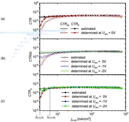 An important requirement is that the range of variations in the current applied to the device input, for which the value of CRT coefficient remains constant, should be as wide as possible. For a current density range from 55 to 580 mAcm−2, where the dependence could be considered linear, the CRT value was about 0.13% and was similar to those found in the literature [4,8,38]. However, in the tested systems, the CTR value was only approximately constant over a limited range of current density . Moreover, the current transfer ratios for the DC and AC components, and , respectively (where the rms subscript denotes the root mean square value), were not equal for all current density values.