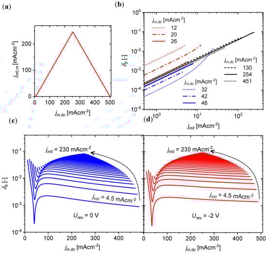 In the case where and , the DC and AC current transfer ratios have similar values, , which apparently do not depend on the current intensity, as can be seen in Figure 6. However, the DC and AC CTR values are not exactly equal and constant in the OPC input current density ranges described above. The coefficients changed slightly with the change in current density resulting in the deterioration of linearity of the transmitting of high-amplitude AC currents (). In order to estimate the degree of this nonlinearity, we assumed that the range of linear operation of the example OLED/OLSD optocoupler for = 0 V was within the current density limits from the threshold value = 6 mAcm−2 to the maximum value = 500 mAcm−2 (Figure 6c). For the assumed range of the constant component of current density, the maximum possible amplitude of the variable component of current density () depended on the value of the constant component and was for or for , as shown in Figure 7a.