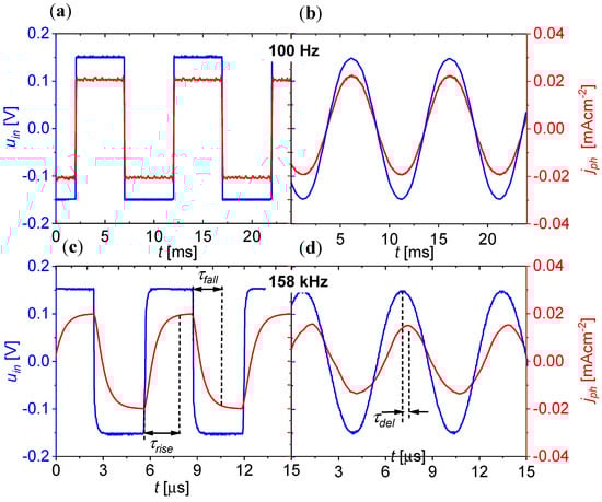 Figure 8 shows sample waveforms of the variable components of the voltage applied to the device input and and the corresponding current densities at the photodetector output and developed based on the measured oscillograms (see Supplementary Information Figure S5). The results are presented for two selected frequency values of 100 Hz and 158 kHz. At 100 Hz, there was no attenuation of the signal at the output of the device. There was no phase shift in the output current relative to the input voltage, and the input current increased immediately after the voltage jump (on a time scale corresponding to the period of a rectangular voltage wave). However, at a frequency of 158 kHz, the response to a rectangular wave did not resemble the shape of the input voltage. The rise and fall of the output current corresponded to the rise () and relaxation () times of 2 μs, respectively.