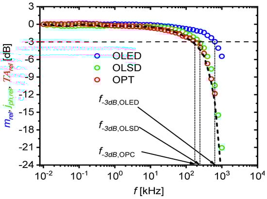 Comparison of frequency spectra for relative amplitude of radiant emittance of the OLED (blue circles), relative amplitude of photocurrent density of the OLSD photodiode (red circles), and relative transadmittance of the OLED/OLSD optocoupler (green circles). Dashed curve—spectrum resulting from multiplication of and spectra. Vertical dotted lines indicate three-decibel cutoff frequencies of OLED , OLSD and OPC .