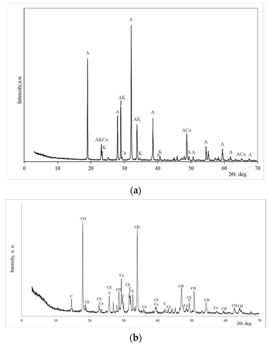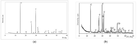 The mineral composition of the phosphogypsum was determined according to X-ray analysis, and it is presented in Figure 2a. The calcium sulfate semi-hydrate Ca(SO4)·0.5(H2O) dominated in phosphogypsum with the impurities of brucite CaPO3 (OH)2·H2O. A similar mineral composition had building gypsum (Figure 2b): semi-hydrated Ca(SO4)·0.5(H2O) dominated, and dolomite with anhydrite was detected as an impurity.