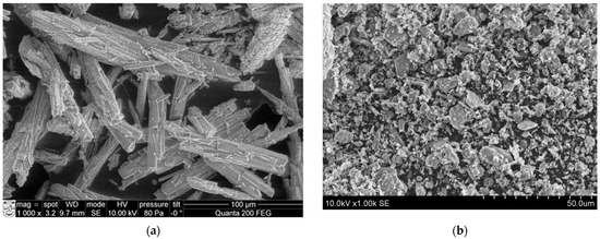 Scanning electron microscopy (SEM) analysis was used to determine the microstructure of the initial materials such as phosphogypsum and building gypsum. In Figure 3, it is evident that phosphogypsum consists of distinct prismatic and needle-shaped crystals, with an average length measuring between 100 and 200 µm and a diameter measuring between 15 and 20 µm. In Figure 3b, it can be seen that building gypsum is composed of finer particles compared to phosphogypsum particles [23,24,25,26].