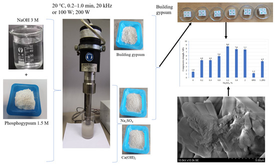 This study comprises two distinct but interrelated parts. The first part involves optimizing the conditions for the conversion of phosphogypsum to a Ca(OH)2 and Na2SO4 solution. The second part focuses on enhancing the mechanical properties of gypsum through the use of a sodium sulphate additive derived from the conversion of phosphogypsum. An ultrasonic disperser was employed to accelerate the reaction between phosphogypsum and a sodium hydroxide solution. The mean dispersion time was found to be 0.2, 0.5, 1.0, and 2.0 min. The resulting product was a solution of calcium hydroxide and sodium sulfate. The impact of varying quantities of Na2SO4 on the compressive strength and density of building gypsum samples was investigated. An increase in the quantity of sodium sulphate from 0.2% to 2% resulted in a notable rise in the density of the building gypsum samples, from 1127 kg/m3 in the reference sample to 1264 kg/m3 in the sample containing 2% sodium sulphate. Therefore, in all instances, the utilization of the Na2SO4 additive in the gypsum samples resulted in elevated compressive strengths (4.8–8.6 MPa) in comparison to the reference sample devoid of this additive (1.6 MPa).