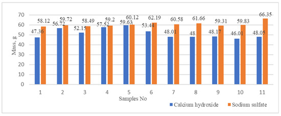 The mass of new formations produced during the conversion of phosphogypsum to calcium hydroxide and sodium sulfate was determined (Figure 7). The use of ultrasonic dispersion at a lower power setting (100 W) yielded an average of 55.89 g of calcium hydroxide, with a maximum of 59.63 g (Figure 7). Nevertheless, an increase in the intensity of ultrasonic dispersion to 200 W resulted in a slight reduction in the average amount of calcium hydroxide, which was approximately 48.17 g, with an average value of 47.65 g (Figure 7).