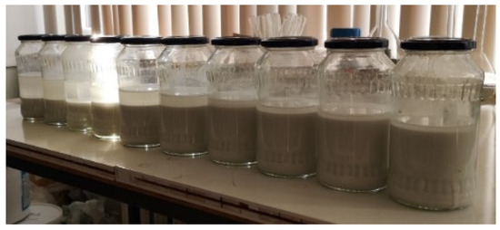 The duration of ultrasonication of the suspension was increased from 0.2 to 2.0 min, resulting in the enhanced formation of calcium hydroxide and the improved dispersibility of the solid phase. Furthermore, an increase in the ultrasonic treatment power led to a notable enhancement in the dispersity of the solid material phase, as illustrated in Figure 8. This photograph depicts a clear reduction in the size of solid material particles, accompanied by an increase in the volume of solid materials.