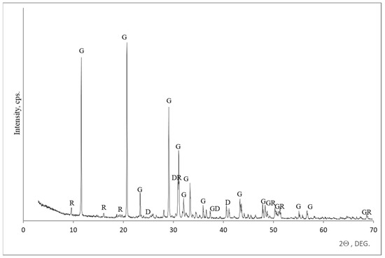 Mineral composition of building gypsum samples according to XRD analysis. Notes: G is gypsum CaSO4 2 H2O (33–311), D is dolomite Ca Mg (CO3)2 (84–1208), and R is hydroglauberite Na10 Ca3 (SO3)8 ·6 H2O (24–1071).