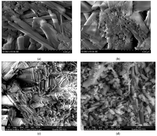 Microstructure of hydrated building gypsum (a,b) and phosphogypsum (c,d) samples: (a,c) sample without additive; and (b,d) sample with the addition of sodium sulphate (Na2SO4).