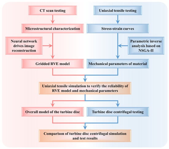 Based on this, a fast and accurate inverse analysis method is proposed to obtain the mechanical properties of 2D woven SiCf/SiC composites, and the damage of the turbine disc under the two braiding schemes is evaluated using the finite element simulation technique. The technical route of this study is shown in Figure 1. Firstly, the meso-structural characteristics of SiCf/SiC composites are obtained based on CT scanning technology. And the RVE model with material structure features is reconstructed using a deep learning neural network in Dragonfly v2.1.0 software. Then, an inverse analysis of the uniaxial tensile stress-strain curves of the SiCf/SiC composites is carried out using NSGA-II to obtain the isotropic mechanical parameters. Subsequently, the obtained material parameters are used as input values of the RVE model for uniaxial tensile simulation. The uniaxial tensile simulation results are compared with the experimental results to verify the reliability of the RVE model and the inverse analysis method. Finally, based on the above parametric inverse analysis method, the damage of the turbine disc is simulated under different weaving schemes and rotating speeds and verified by a centrifugal test. The results of this study provide a new method for obtaining the anisotropic mechanical parameters of SiCf/SiC composites with different braiding schemes.