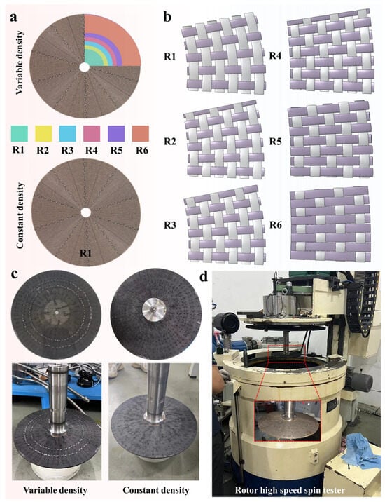 This study used the turbine disc structures of two fiber-based formulation schemes for centrifugal testing. As shown in Figure 3a, one is a variable density woven turbine disc, and the other is a constant density woven turbine disc. Specifically, the variable density design was determined by our preliminary simulations based on the stress distribution when the turbine disc is subjected to centrifugal loading. The variable density turbine disc was composed of six kinds of woven fabrics, and the fabric structure under different braiding methods is shown in Figure 3b. This design takes into account the different parts in the work of the mechanical performance requirements by adjusting the weaving density to optimize the overall structure. The warp and weft density values corresponding to the above six weaving schemes are shown in Table 1. It can be noticed that with the increase of the distribution radius, the longitudinal direction of the circular fabric is becoming denser, and the latitudinal direction is becoming less dense. The whole constant density turbine disc was woven like R1 in the variable density turbine disc. This scheme simplifies the manufacturing process even more, but in some cases, it may not be as targeted and adaptable as the variable density scheme above. The two turbine disc samples used for centrifuge testing are shown in Figure 3c. The average thickness of both samples was 5.5 mm, with an inner aperture of 12.2 mm and an outer diameter of 277.2 mm. Moreover, three turbine discs of each type were used for the centrifugal testing, and the average of the destructed rotational speeds was taken as a contrasting value for the subsequent simulation results. A high-speed rotating test bed (Hengchao Installation and Testing Technology Co., Ltd., Beijing, China) with the highest speed of 40,000 RMP was used to test the turbine disc, and the test instrument is shown in Figure 3d.