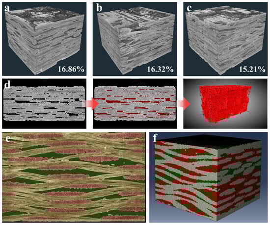 The visualization model of 2D woven SiCf/SiC composites at three positions after treatment by AVIZO 2019 software is shown in Figure 4a–c. It can be seen that the SiCf/SiC composites are mainly composed of three parts, namely, SiC fiber bundles, SiC matrix, and pores. Moreover, it is found from Figure 4a–c that the SiC matrix fills into the fiber bundles more densely, but the surface of the whole fabric is not smooth. There are a lot of unfilled areas between the longitudinal and zonal fiber bundles, so porosity is an essential part of the composite at the meso-scale.