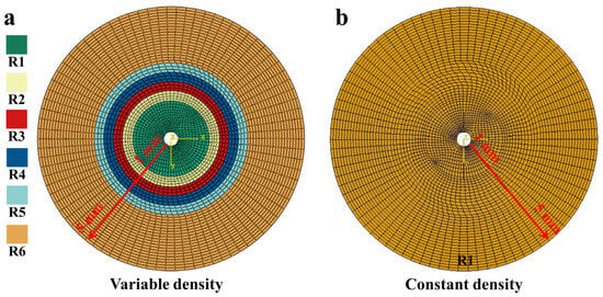 Figure 5 shows the mesh models of two types of turbine disc. The geometry of the two models is identical to that of the specimens. The number of meshes and nodes are 6990 and 10,692, respectively. The mesh type is a hexahedral element (C3D8R) with reduced integration. In order to improve the computational accuracy of the model and reduce the computational time, the variable-size mesh was used in this study. As shown in Figure 5, the mesh size of the model linearly increases from the inside to the outside along the radius. Of these, the mesh size at the model’s center is 1 mm, and the mesh size at the outer edge is 5 mm. Then, the radial displacement at the circular hole of the turbine model and the rotation displacement in the x, y and z direction is restrained, and centrifugal force is applied to the disc model to simulate the centrifugal testing process. Finally, the ABAQUS2021 Standard module was used to solve the model.