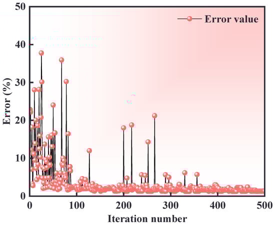 The stress-strain curves obtained by uniaxial tension are imported into Insight 2022 software, and the optimization algorithm is selected as NSGA-II. Then, 40 iterative steps are set with precision controlled at 1 × 10−6. The initial values of Umat parameters, including the tensile, compressive, shear strength, and anisotropic modulus of the fiber are set, and the optimization interval is set. The minimum sum of squares of the relative error between the calculated and experimental results is taken as the objective function for the parameters inverse analysis, as shown in Equation (17). The convergence process and the relative error are shown in Figure 6.