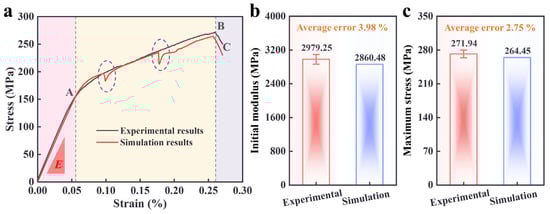 Comparison of uniaxial tensile test and simulation results. (a) Stress-strain curve. (b) Initial modulus. (c) Maximum stress. (A, B, C are the damage states of the specimens at different stages respectively. E is the initial modulus).