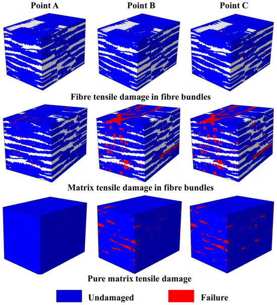 Figure 8 shows the fiber-dominated tensile damage distribution in the fiber bundle, the matrix-dominated tensile damage distribution in the fiber bundle, and the pure matrix damage distribution for the RVE model at points A, B, and C in the stress-strain curve. Among them, the red part represents the damage to the fiber bundle unit or the matrix unit, and the blue part represents the undamaged matrix or the fiber bundle unit. When the strain is 0.06%, at point A, there is no damage to the matrix in the mesoscale cell. There is a small amount of matrix damage in the braided yarns perpendicular to the tensile direction, so the matrix damage in the fiber bundle perpendicular to the tensile direction is the main reason for the stiffness reduction of the AB segment. At point B, we can see that there is still no tensile damage in the bundle. However, the tensile damage of the matrix is much more than that of point A, and the matrix units begin to be damaged. From the pure matrix damage diagram, one can find the site where the matrix damage first appears. The damage is often in the periphery of multiple pores and the weakest place of the matrix unit in the single cell. The stress concentration caused by the pores is the leading cause of these lesions. The decrease of matrix content in the cross-section is also one of the reasons for the first matrix damage, and the matrix crack growth is perpendicular to the tensile direction. Point C represents the final failure stage of the RVE model when tensile damage begins to occur in the bundle. The fiber damage in the bundle often occurs from the edge of the yarn parallel to the drawing direction and gradually extends to the center of the yarn.