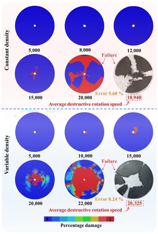 The simulation results of two kinds of turbine discs at different rotating speeds are also presented in Figure 9. It can be noticed that when the rotating speed of the constant density turbine disc reaches 12,000 r/min, cracks appear at the center of the disc body first. Then, when the rotating speed reaches 20,000 r/min, the outer edge of the constant density turbine disc body breaks up, and the central clamping part gradually disintegrates and disintegrates. At 12,000 r/min, cracks first appeared in the center of the variable density disc. Subsequently, when the rotating speed reaches 22,000 r/min, the central part of the disc will be destroyed directly because of the vibration of the disc. The results of constant and variable density simulation show that the simulation pieces are damaged from the center of the disc body, and the fracture mode is split into fan-shaped fragments. The crack propagates directly along the radial direction until the crack develops to the outer edge of the disc body. However, a larger area of damage is found in the center of the variable density turbine disc, which is caused by the weak strength of the braided body.