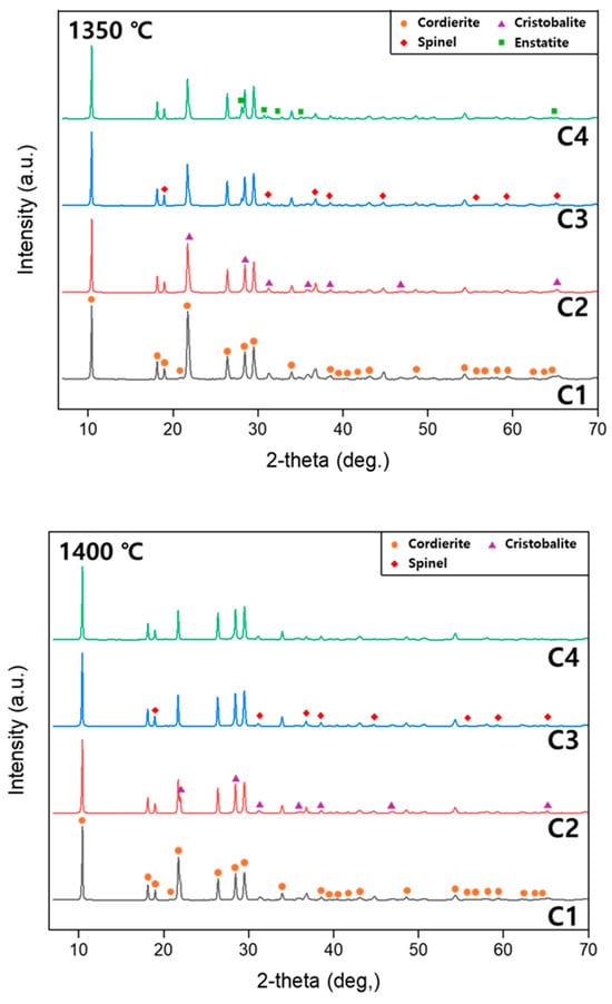 - All the samples sintered at 1300, 1350, and 1400 °C contained cordierite as the primary phase, with more cordierite forming as the temperature increased. In contrast, secondary phases, such as spinel, cristobalite, and enstatite, tended to decrease as the sintering temperature increased. Additionally, it was observed that the intensity of cordierite decreased as the M/A ratio increased.