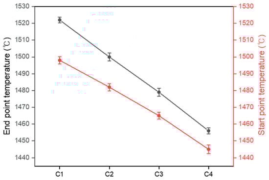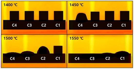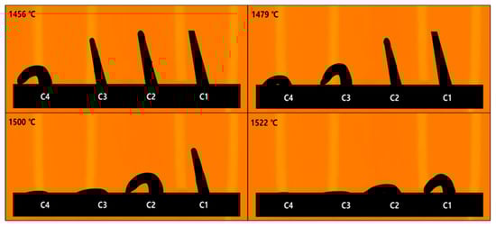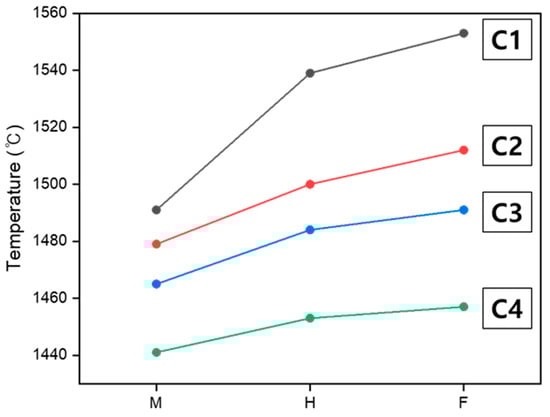 - As the M/A ratio increased from 1 to 1.86, the liquid formation temperature and the characteristic temperatures of softening, melting, and flowing decreased, the viscosity decreased, and the fluidity of the viscous liquid increased. The observed thermal behavior demonstrated that the maximum sintering temperature decreased from 1491 °C to 1441 °C, the hemisphere temperature decreased from 1539 °C to 1453 °C, and the flow temperature decreased from 1553 °C to 1457 °C. The time from the maximum sintering temperature to the flow temperature was reduced from 6 min 12 s to 1 min 36 s, indicating that the thermal behavior was accelerated. Additionally, the start point temperature of the pyrometric cone decreased from 1498 °C to 1445 °C, and the end point temperature decreased from 1522 °C to 1456 °C, with the time from the start to the end of deformation reduced from 9 min 36 s to 4 min 24 s, indicating an increase in the deformation rate.