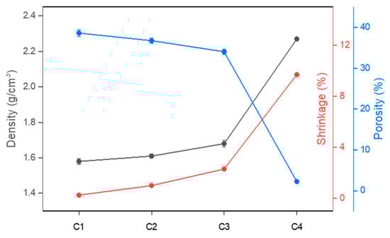 - As the M/A ratio increased from 1 to 1.86, a low-viscosity liquid phase was formed at lower temperatures, enabling it to easily infiltrate between particles. Consequently, the density of the sintered bodies increased from 1.56 g/cm3 to 2.27 g/cm3, the porosity decreased from 38.62% to 2.24%, and the shrinkage increased from 0.25% to 9.7%. As densification was promoted, grain boundaries gradually became blurred, and larger grains grew.