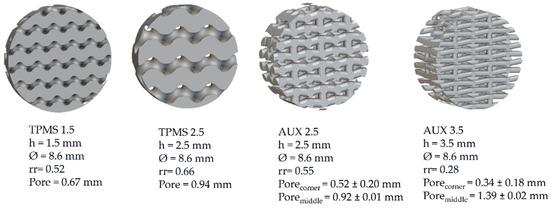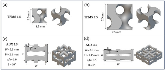 Two different skeletal-based gyroid TPMSs, namely, TPMS 1.5 (Figure 1a) and TPMS 2.5 (Figure 1b), and two different auxetic re-entrant bow-tie structures, namely, AUX 2.5 (Figure 1c) and AUX 3.5 (Figure 1d), were designed by means of nTop software, V4.2.3 (nTopology Inc., New York, NY, USA).