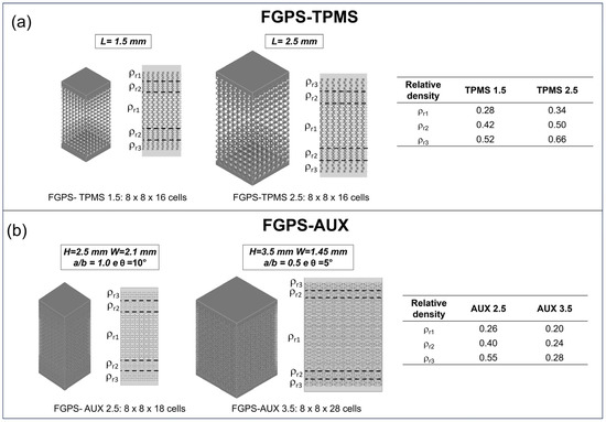 The FGPSs are designed by fixing the dimension of the lowest relative density level (ρr1 in the middle of the FGPS structure) equal to the dimension of the corresponding single-density specimen designed for mechanical testing. A linear ramp, having a length of 0.2 mm, is generated between the level constants to connect continuously the different porosity levels. Two solid bases with a thickness of 2 mm are added at the bottom and at the top of the structure to evaluate the connection between porous and bulk parts in the implant and to guarantee a flat surface for mechanical testing. The highest (ρr3) and the lowest (ρr1) relative density levels are designed, respectively, to favour osseointegration and to decrease the elastic modulus close to that of the cancellous bone. All CAD parameters are characterised by means of 3D image analysis software ORS-Dragonfly 2022.2 (Comet Technologies Canada Inc., Montreal, QC, Canada). The software measures the different dimensions by means of the wall thickness analysis method, which consists of evaluating the local thickness of the ligament/strut or pore by fitting its volume with the maximum spheres at each location in the 3D structure [18,27,59,61]. Examples of the data obtained using 3D image analysis for TPMS and auxetic re-entrant bow-tie structures are shown in Figure 3.