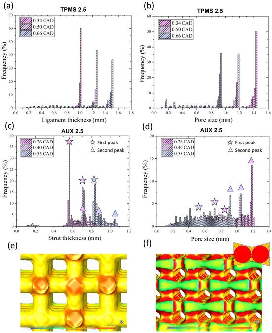 Histograms of the (a) ligament thickness and (b) the pore size of FGPS-TPMS 2.5 and (c) strut thickness and (d) pore size of the FGPS-AUX 2.5. (e) Mapping of the strut thickness of AUX 2.5 highlighting the struts and nodes. (f) Mapping of the pore size to justify the two peaks present in the corresponding histogram.