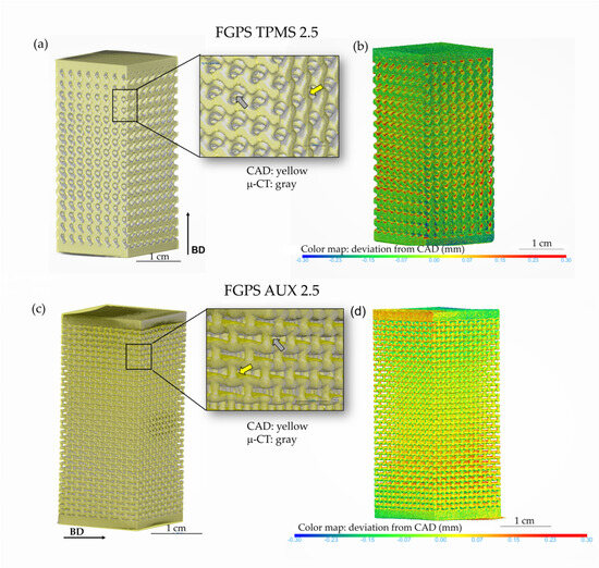 μ-CT 3D images are used to evaluate the quality of the printed process in terms of dimensional deviation. The overlap of CAD (yellow) on the μ-CT image (grey) and the relative colour map of the deviation in case of TPMS-FGPS 2.5 and FGPS-AUX 2.5 are shown in Figure 5, respectively.