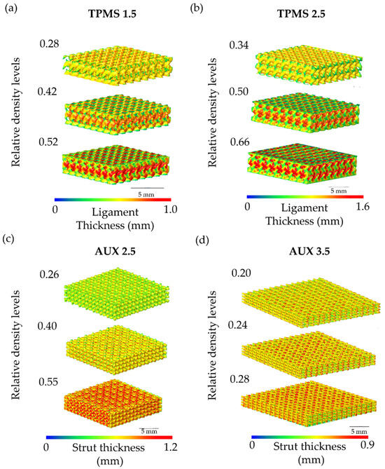 Color maps of the ligament thickness of the three relative density levels of (a) TPMS 1.5 and (b) TPMS 2.5. Strut thickness color maps of the three relative density levels of (c) AUX 2.5 and (d) AUX 3.5 obtained with Dragonfly software.