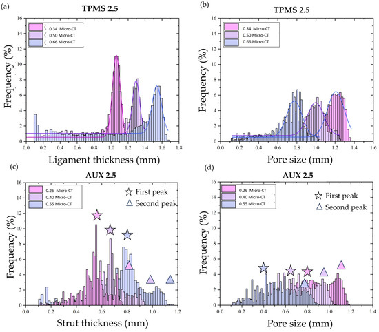 Data distributions of TPMS 2.5 in case of (a) ligament thickness and (b) pore size. Data distribution of AUX 2.5 in case of (c) strut thickness and (d) pore size.