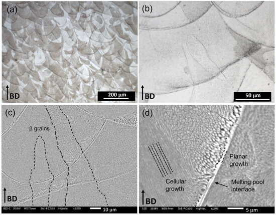 The cross-section parallel to the building direction (BD), captured using LOM (Figure 10a), indicates a near-fully dense material and reveals the melt pool boundaries. At higher magnification (Figure 10b), the different solidification morphologies are visible due to the layer wise manufacturing process. The epitaxial growth of β grains, extending several millimetres in length, results from the partial remelting of previously consolidated layers, as demonstrated in earlier works. SEM micrographs at higher magnification emphasize the β grain boundaries (Figure 10c) and the solidification morphology aligned along the heat flow (Figure 10d). The average quasi-static and the average of five loading–unloading compression curves for single density and FGPS samples structures are summarised in Figure 11.