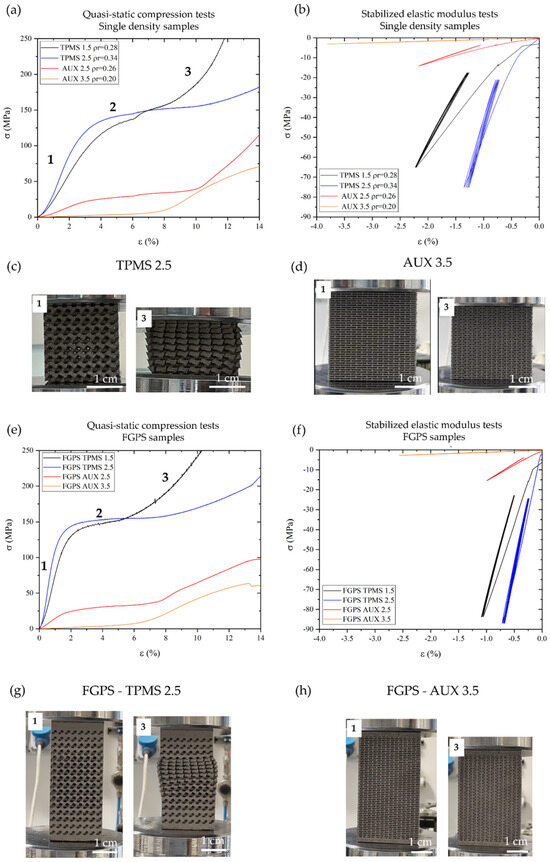 To stabilise the mechanical behaviour, five loading–unloading cycles between 20% and 70% of the yield stress are conducted (Figure 11b). A change in slope is observed after the first loading–unloading cycle, which remains consistent throughout the subsequent four cycles. Higher slopes for the elastic modulus after achieving mechanical stabilisation following a preload are evident in all single density structures. Focusing on FGPS structures, designed to optimise the mechanical and biological response of the component, the effect of gradient porosity on the mechanical response is investigated through quasi-static compression tests and five loading–unloading tests at stress levels ranging from 20% to 70% of the yield stress, equal to those performed on single-density samples. The average curves of both quasi-static compression tests and stabilised elastic modulus tests on FGPS are reported in Figure 11e,f, respectively. As in the case of the single-density samples, a linear elastic regime (1), a plateau regime (2), and the final densification regime (3) are highlighted in the curves. The plateau regime is not observed in the FGPS AUX 3.5 since the densification of the auxetic re-entrant bow-tie structure occurs before the collapse as shown in the single-density sample. Details of the deformation occurring in the FGPS structures during stage 1 (the linear elastic region) and stage 3 (densification regimes) are illustrated in Figure 11g,h for FGPS-TPMS 2.5 and FGPS-AUX 3.5, respectively.