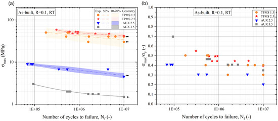 where Nf represents the number of cycles to failure. The inclusion of runout tests in the fitting process aimed to provide a more robust and conservative estimation of the S-N curve. The coefficients ki (i = 1, 2, 3) are evaluated by fitting σmax vs. Nf curve on a logarithmic (log10) scale. The dispersion of the fatigue data is evaluated by calculating the estimated regression variance, assumed to be uniform across the entire fatigue life range and expressed in Equation (5).