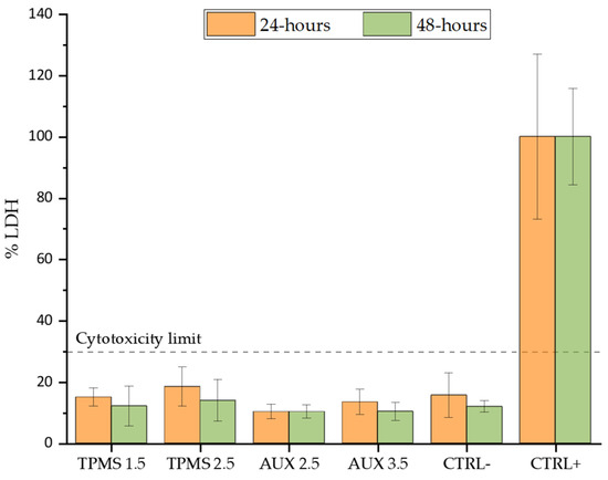 An indirect cytotoxicity assay under ISO 10993-5 is performed, using the above-mentioned culture medium with serum as the extraction vehicle. The samples are immersed in the extraction medium for 72 h at 37 °C in a volume calculated according to the ISO10993-12 for larger moulded items with thickness greater than 1 mm [69]. Subsequently, 100 µL of the medium is extracted and introduced to cells cultured in the 96-well plate at 70% of confluence. The positive control (CTRL+) involves fully lysed cells using a lysis buffer, which induces maximum LDH release. The negative control (CTRL−) is considered to be 100 µL of normal medium in contact with the cells. Wells containing culture medium without cells are considered blank samples. Cytotoxic effects are evaluated after 24 h and 48 h. At each time point, the medium from each well is collected and an LDH assay (CyQUANT™ LDH Cytotoxicity Assay kit, ThermoFisher Scientific, Fisher Scientific Italy, Rodano, Italy) is performed following the manufacturer’s instruction. Briefly, 50 µL of the medium of each sample is transferred into a transparent 96-well plate and mixed with 50 µL of the reaction mix. The plate is later incubated for 30 min in a dark environment. After this, the reaction 50 µL of Stop solution is added into each well to end the reaction. LDH release is quantified by measuring wavelength absorbance at 490 nm with a microplate reader (Tecan Infinite M200, Tecan Group Ltd., Männedorf, Switzerland).