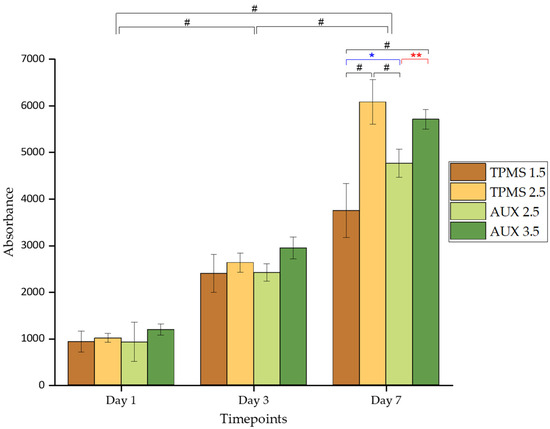 - Compared to the AUX samples, TPMS 2.5 exhibited higher metabolic activity in the AlamarBlue assay. This can be attributed to its continuous, large surface area, and favourable curvature that closely mimics trabecular bone. These features create an optimal environment for cells to adhere, grow, and migrate effectively.