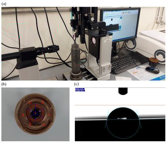 The wettability tests were conducted using a DataPhysics OCA15Pro (DataPhysics Instruments GmbH, Filderstadt, Germany) measuring machine equipped with a goniometer, which consists of a camera, a liquid dispensing system, and a computer with SCA20 software (version 6.1, DataPhysics Instruments GmbH, Filderstadt, Germany) for OCA and PCA, used to control the camera and dispensing functions (Figure 3a).