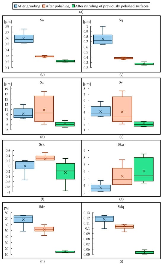 Box and whisker plots for surface parameters of the stamps obtained after the three finishing methods; the legend to (b–i) can be found in (a).
