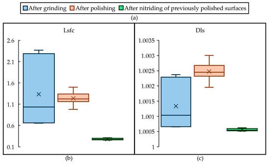 The Lsfc and Dls parameters are scale-dependent fractal analysis parameters, defining the relevant fractal complexities and fractal dimensions, respectively. The graph in Figure 6 shows the distributions of the Lsfc and DIs parameters as a function of the processing state. With successive machining phases, Lsfc decreases and DIs increases. The distribution of both also narrows. This observation shows that polishing and nitriding significantly reduce the fractal complexity of surface topographies.