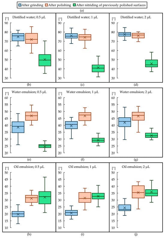 Box-and-whisker plots showing the obtained values of wetting angles for the three liquids tested, the three droplet sizes and for the different stamp finishing treatments, the legend for plots (b–j) can be found in (a).