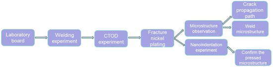 The steel catenary riser is an important part of the deep-sea oil and gas production system. It is made of welded pipe/seamless pipe connection. In harsh service environments, the steel catenary riser will face complex working conditions such as surge, vortex-induced vibration, and variable load [1,2]. In the process of steel pipe manufacturing, welding residual stress, uneven structure, and mechanical properties will inevitably occur in the weld area, which makes it easy to produce minor defects in the service process of welding [3,4,5,6]. These defects have no obvious plastic deformation on the macroscopic scale, and the deformation is mainly concentrated in the crack tip area. In the low-temperature environment, the rapid expansion of these cracks leads to a sharp reduction in the life of the pipeline [7]. Therefore, the research on the anti-crack propagation ability of weld metal has gradually attracted people’s attention. The crack tip opening displacement (CTOD) experiment can be used to determine the fracture toughness of the full thickness of the welded joint because the CTOD experiment can exclude the crack initiation energy and accurately detect the critical crack size and critical load; thus, the fracture toughness of the material containing small defects can be evaluated [8,9].