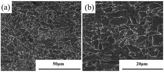 The laboratory-made plate used in this experiment is X65 steel. Its chemical composition is shown in Table 1. The thickness of the steel plate is 30 mm. Figure 1 shows the SEM characterization of the base material. It could be observed from Figure 2a that the microstructure of the base material was mainly composed of granular bainite and ferrite, with a grain size of 5–16.5 μm. Figure 2b shows that the small M/A (martensite/austenite) components were dispersed at the ferritic grain boundaries. A rod-shaped tensile sample with a diameter of 5 mm and a length of 65 mm, oriented perpendicular to the rolling direction, was taken and subjected to room-temperature tensile testing according to the GB/T228.1-2021 [25] standard. The mechanical properties of the base material were shown in Table 2. The yield strength Rp0.2 was 493.5 Mpa, and the tensile strength Rm was 602.5 MPa.