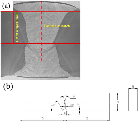 The CTOD experiment sample was a three-point bending standard sample. A 150 mm × 30 mm × 15 mm block sample was taken from the center of the weld seam, and a mechanical notch was made at the center of the weld seam as shown in Figure 3. The sampling position is shown in Figure 3a. A mechanical notch was made in the center of the weld (as shown by the dashed line in Figure 3a), as depicted in Figure 3b. The fatigue crack was prefabricated by a fatigue experimenting machine at room temperature, and the initial crack length was 13.2–14.26 mm. According to GB/T-21143-2014 standard, the crack tip opening displacement experiment was carried out with GNT200 universal experimenting machine (NCS, Beijing, China) under the condition of −10 °C, and three sets of parallel experiments were carried out for each weld. The CTOD value was calculated according to GB/T-21143-2014 [26] standard, and the formula is as follows: