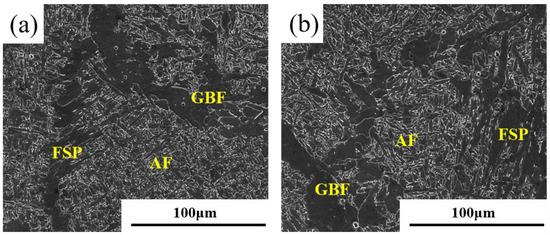 SEM characterization of AF, FSP, and GBF in weld metal. (a) 5# weld metal; (b) 1# weld metal.
